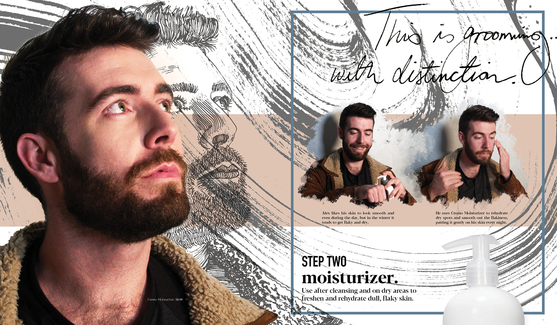 A conceptual catalog of proposed men's makeup products by the brand CREMO, as an extension of their 2019 grooming collection. The package design for this project won a 2019 American Advertising Federation Student ADDY Award.