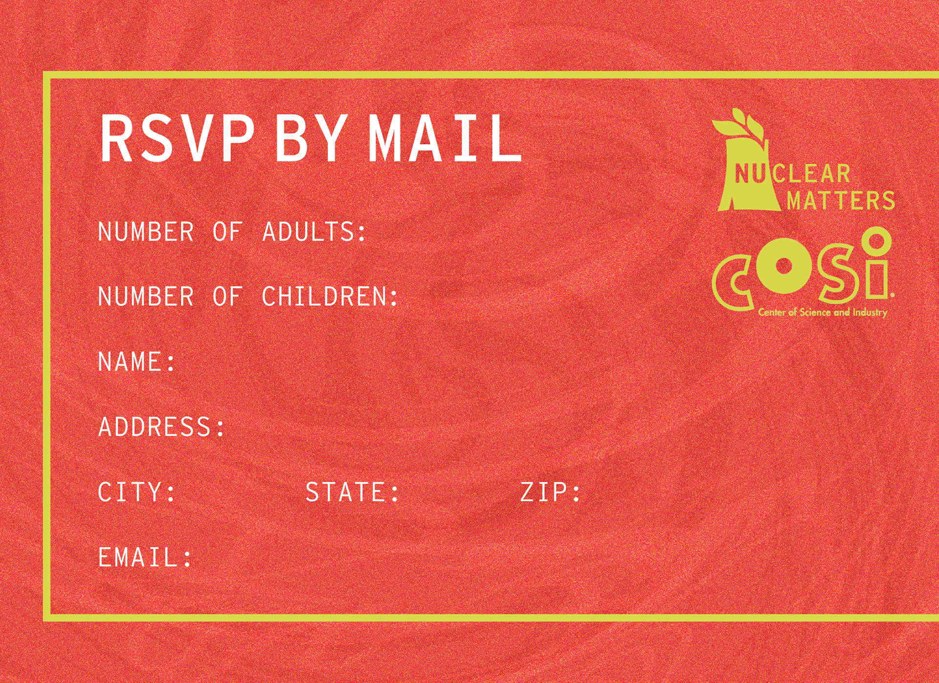 The direct mailer I designed has the function of promoting a COSI Exhibit, targeting kids 15 years old and younger. Sponsored by Nuclear Matters. It contains more original illustrations, an RSVP invitation for the opening of the exhibit, and some basic information about nuclear energy that will be covered. The design is bright and fun to catch the eye of its young audience.