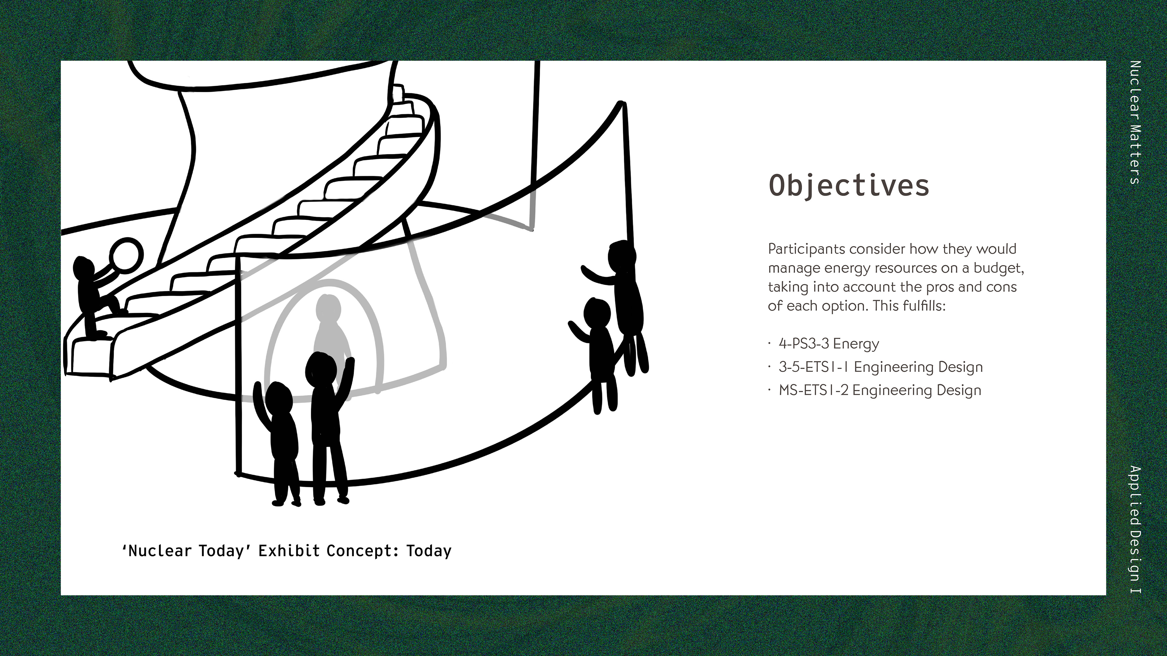 As another deliverable, I wanted to create a positive memorable experience around Nuclear Energy for my youngest demographic, Generation Z. To do this, I conceptualized a sponsored collaboration between Nuclear Matters and COSI - The Center of Science and Innovation. This collaboration would include an interactive, fun exhibit that highlights two key ideas: nuclear energy today and tomorrow. Nuclear Today is a play place for kids 10 years old and younger and digital challenge for kids 10 to 15 years old. Nuclear Tomorrow is an interactive and creative space for all ages. Each of these parts fulfill several key Ohio learning objectives for elementary and middle-school aged children; making the exhibit ideal for field trips and educational outings.